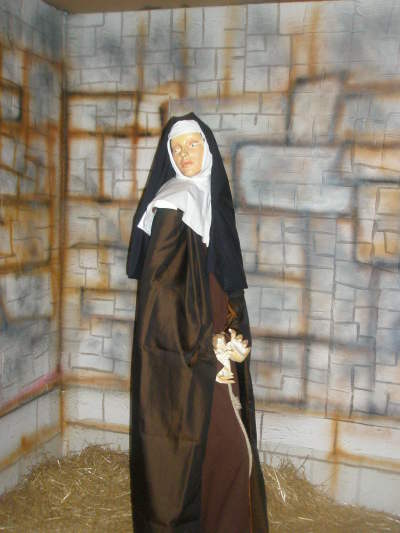 • DESCRIZIONE: Il Presepe di questo Natale 2011 è dedicato a Santa Chiara ad 800 anni dalla Consacrazione. Narra l'evento storico del Natale 1252 quando Chiara impossibilitata a vedere Messa e il Presepe, la notte di Natale ricevette la grazia di una visione nel dormitorio dove era allettata. Vide il Presepe e la Messa che si celebrava in Assisi,successivamente Santa Chiara divenne patrona delle telecomunicazioni e della televisione. I nostri giovani hanno realizzato un grande schermo con Assisi, da un lato si pèuò notare la chiesa di San Damiano dove vi è rappresentata la Natività; al centro il Palazzo del Popolo e la Chiesa di Santa Maria sopra Minerva e in alto la basilica di San francesco che in prospettiva viene vista da dietro. i materiali utilizzati sono polistirolo, gesso, iuta, legno e canne. per gli elementi vegetali abbiamo utilizzato in partticolare timo selvatico. il presepe è inserito nel contesto della cella di Santa Chiara e comprende anche la santa stessa che guarda il presepe.