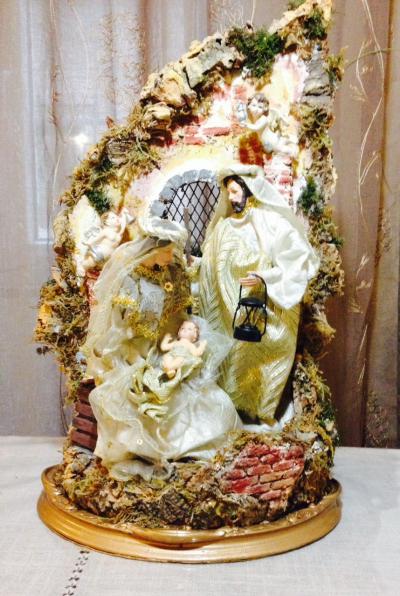 • Descrizione: natività con sfondo in sughero su base ovale e angeli sullo sfondo DIMENSIONI: base 32x24 altezza 48cm